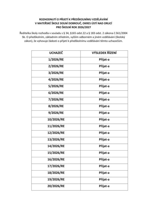 Úvod > Volný čas > Aktuality > Rozhodnutí o přijetí k předškolnímu vzdělávání v MŠ Dolní Dobrouč pro školní rok 2026/2027