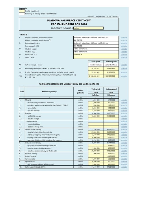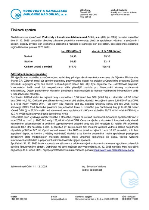 Úvod > Volný čas > Aktuality > Tisková zpráva - plánovaná cena vody pro kalendářní rok 2026 - VAK Jablonné nad Orlicí